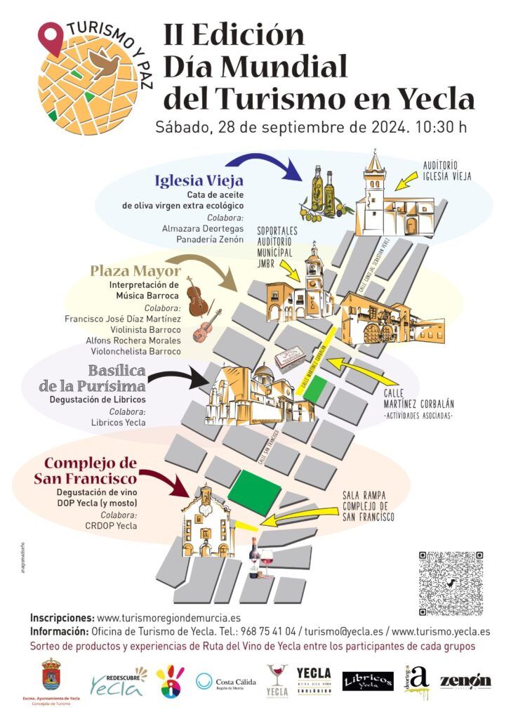 Además, se realizarán sorteos de productos y experiencias ofrecidos por Ruta del Vino de Yecla entre los participantes de cada uno de los grupos. La celebración del Día Mundial del Turismo en Yecla está organizado por la Concejalía de Turismo y cuenta con el patrocinio del Consejo Regulador de la DOP Yecla, Panadería Zenón, Almazara Deortegas, Libricos Yecla y Ruta del Vino de Yecla y la colaboración de un violinista y un violonchelista especialistas en música barroca, y representantes del sector turístico y cultural de la ciudad. La actividad es gratuita, tiene plazas limitadas y requiere inscripción previa.
