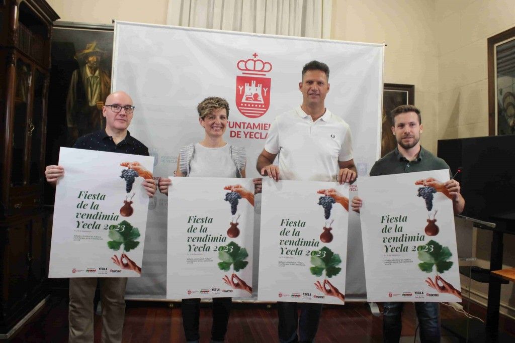 La concejala de Turismo, Isabel Pérez, y el concejal de Cultura, Daniel Jiménez, han presentado junto al presidente de Coros y Danzas de Yecla, José Manuel Gil, y del coordinador de la Ruta del Vino de Yecla, Rubén Soriano, la Fiesta de la Vendimia y Festival Nacional de Folclore de Ciudad de Yecla 2023, que se celebra durante los días 9 y 10 de septiembre, con la participación de los grupos Tajaraste, de Santa Cruz de Tenerife, Virgen del Rosario de Alhama de Murcia y Coros y Danzas de Yecla, ambos de la Asociación Regional Francisco Salzillo.