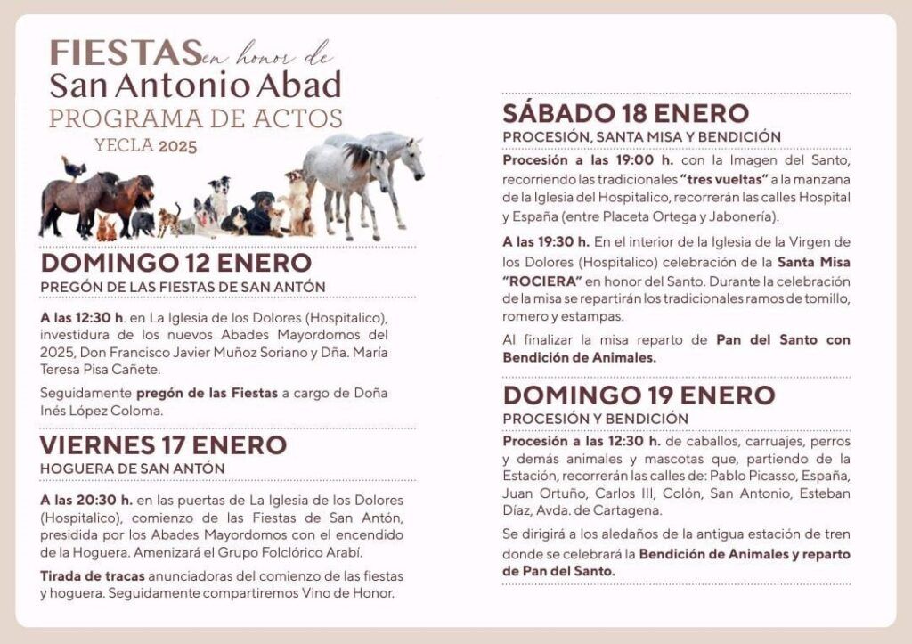 Del 17 al 19 de enero, Yecla se llena de tradición y espíritu festivo con la celebración de las Fiestas de San Antonio Abad, conocidas popularmente como las Fiestas de San Antón. Organizadas por la Asociación de Amigos de San Antón (AMISA) y el Ayuntamiento de Yecla, estas fiestas rinden homenaje al santo protector de los animales domésticos con un variado programa de actos que combina tradición, cultura y devoción.